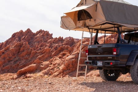 This Gladiator comes equipped with a 2nd Generation Smittybilt rooftop tent that comfortably sleeps 3.