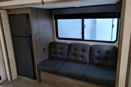 The jackknife sofa can be folded down to accommodate guests or just to enjoy watching 32" TV with ROKU on rainy camp days or an evening or listening to the two zone radio which allows you to listen to your favorite tunes while inside and outside the rig.