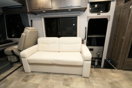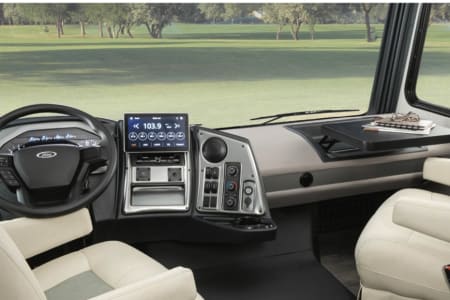 This beautiful RV is Easy to Drive and Park, with a built on a Ford F53 chassis with a 7.3L V8 Engine. This RV offers smooth driving and comes with backup and side cameras for stress-free parking.