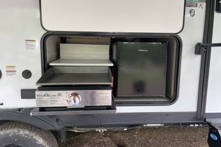 Fully stocked kitchen with plates, bowls, cups, coffee pot, silverware, pots, pans and utensils. Outdoor kitchen with a mini fridge and griddle.