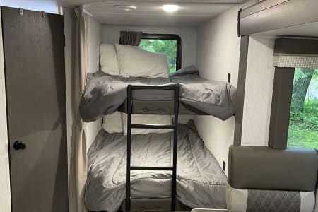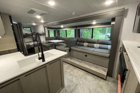New for 2025! This Wildwood X-Lite is perfect for a couple or a family. It provides a private front bedroom and a set of rear bunks. The table and couch also provide sleeping areas for up to 10 (6-8 comfortably).