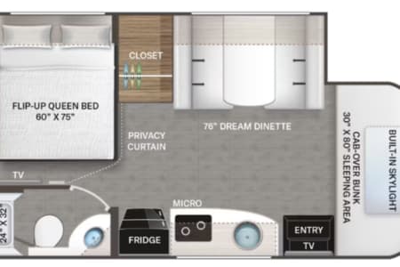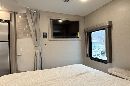 It's also spacious yet compact. At 24 feet, it is easy to maneuver and fits in most campsites while still providing plenty of room for your crew. Keep in mind that a lot of National parks restrict vehicle length, and this is a perfect rig that will easily be allowed in most National and State parks. It sleeps up to 6, with a queen bed, a convertible dinette, and an overhead bunk, there's plenty of sleeping space for families, couples, or small groups. Plus, there is room for 2 pack and plays for the little ones when the motorhome is parked and slide is extended.