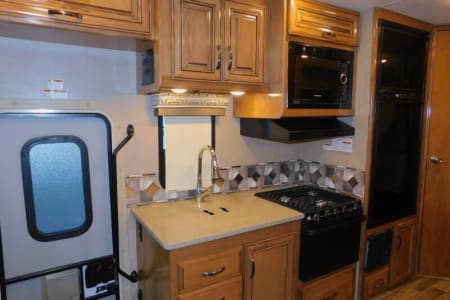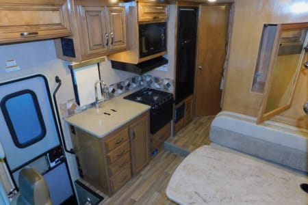 Includes a fridge, freezer, microwave, stove, and the essentials for cooking meals on the go.