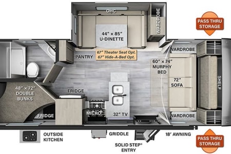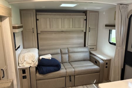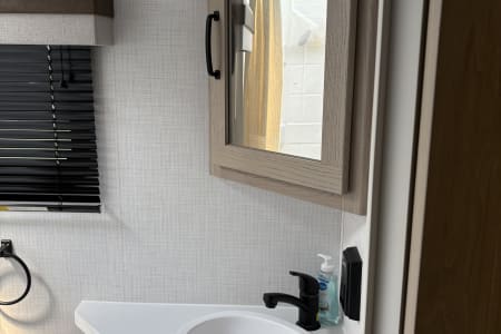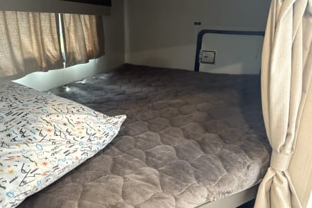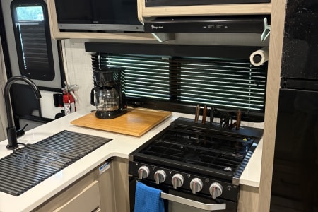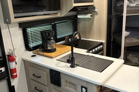 Homey Kitchen: Whether you’re making a quick snack or a full dinner, the kitchen in this RV has everything you need. A 3-burner cooktop, microwave, and a 12V fridge mean you’ll never have to miss out on your favorite meals, no matter where you are.