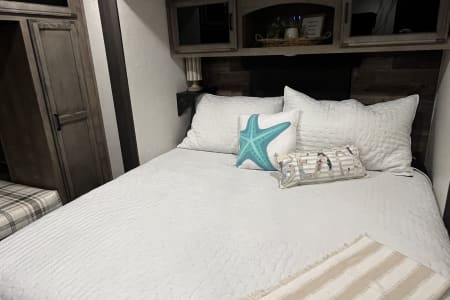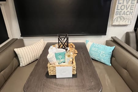Welcome tour beach hideaway in our fully loaded camper great for comfort & relaxation! Relax in front of the duel electric fireplaces for a cozy night inside to watch your favorite movie on the dual heated reclining chairs! The hideaway is perfect for two adults or a family of 4 with a king bedroom in the front and a dinette that makes into a full size bed. Large shower with tankless & on demand hot water! Lots of storage space and a fully equipped kitchen to meet all your entertaining needs! Duel slide outs in bedroom and kitchen living area to maximize your comfort! Lighted & retractable large awning to relax under during those warm summer days, relaxation at its best is just waiting for your beach vacay!