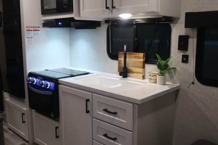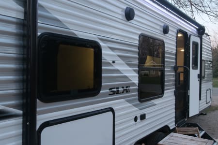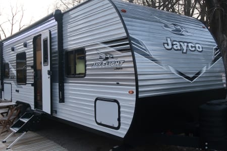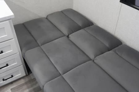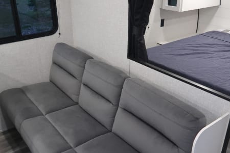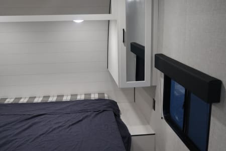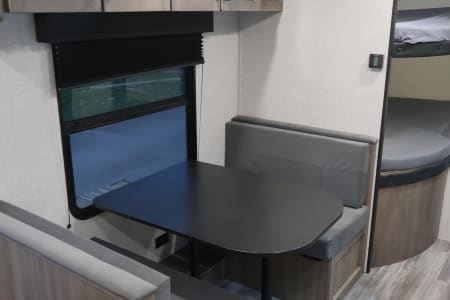 This ultra lightweight and easy to tow, dual axle bunkhouse is PERFECT for your next adventure, near or far! This camper is just long enough to fit all of your friends and family (sleeps 8 comfortably) but short enough to get into just about any camp site. Most all half-ton trucks can tow this easy, even some SUVs. Your weekend home features a walk around Queen bed with privacy door, fold down jack knife sofa, four person dinette that converts to a bed and two double bunk beds. With loads of kitchen storage, you can cook comfortably inside, or set up an outdoor camp kitchen on the good weather days. Modern features, lightweight comfort. Join us, Dune Drifter RV, on your next Northern Michigan adventure!