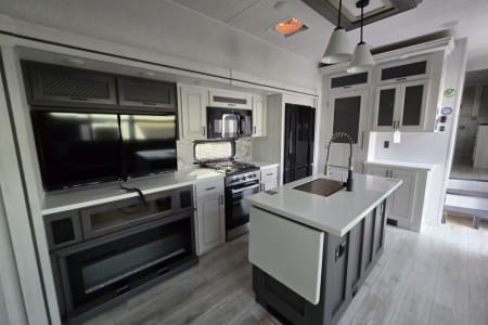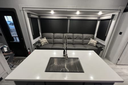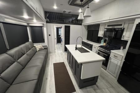 The East to West Ahara 390DS fifth-wheel camper is the perfect getaway for families, comfortably sleeping six people—plus, the oversized couch can accommodate an extra guest.