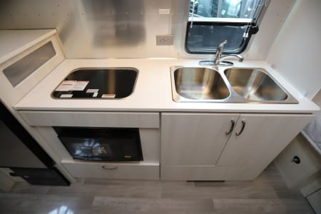 Two adults will sleep comfortably in the full size queen bed, while one adult or two children sleep comfortably on the dinette conversion. (Linens and pillows for dinette conversion are stored under the master bed.) Wardrobe with hanging bar, storage above bed. Kitchen features a 2-burner propane stove, convection microwave and a 4 cu. ft. refrigerator with small freezer. Small pantry storage provided. Flatware, cutlery, serving utensils, serving platter, mixing bowls, wine glasses, wine opener, tumblers, 4-full place settings, pots and pans all provided.