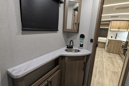 Bathroom Convenience: A full-sized bathroom with a large shower and skylight—no need for campground restrooms!