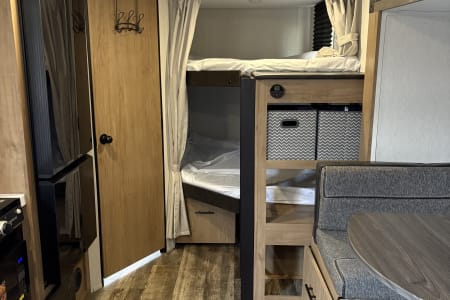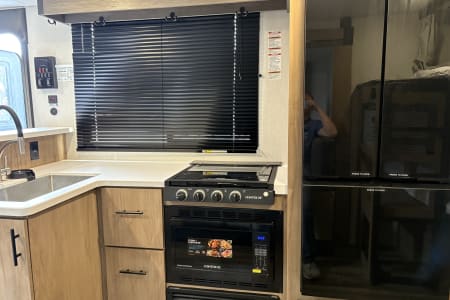 Experience the ultimate in comfort and convenience with the 2024 Forest River Campsite Reserve travel trailer. This thoughtfully designed RV offers a spacious interior featuring a camp king bed, double-size bunks, and a convertible booth dinette, comfortably accommodating up to nine guests. The modern kitchen is equipped with a three-burner cooktop, air fryer, high-rise pull-down faucet with a glass rinser, and a hidden pantry behind the hinged entertainment center, making meal preparation a delight. Enjoy panoramic views through the largest windows in its class, and relax by the cozy electric fireplace. The full bath includes a skylight in the shower for added natural light and headroom. Outside, take advantage of the exterior kitchen with a beverage fridge and grill, as well as mega pass-thru storage for all your gear. Built with the durable TimberStong UltraCore engineered superstructure and featuring a 100-watt solar package, this travel trailer is ready for your next adventure. Book now!