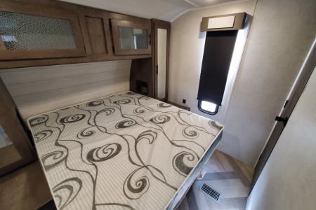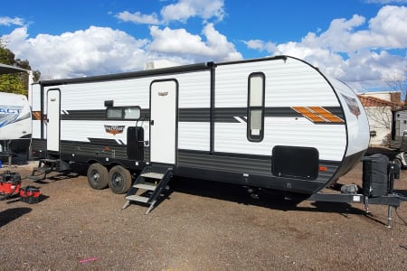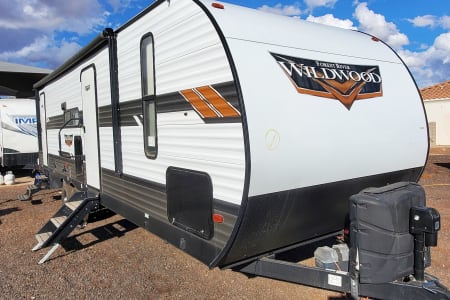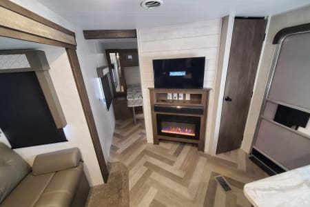 2021 Wildwood 26dbud. Very desirable floor plan with front private queen bedroom with walk-in closet. 32-in TV with electric fireplace. Ducted AC and heat furnace. 20 ft Electric awning. Bluetooth stereo indoor outdoor speakers rear full size bunk beds. Couch and dinette convert to bed. Full size kitchen and bathroom. Outdoor kitchen. Electric tongue jack. Weight distribution hitch and Generator available