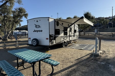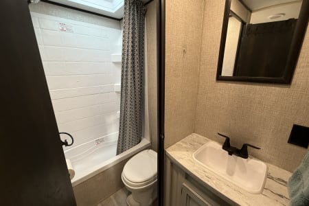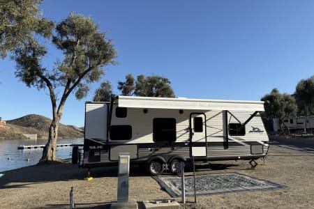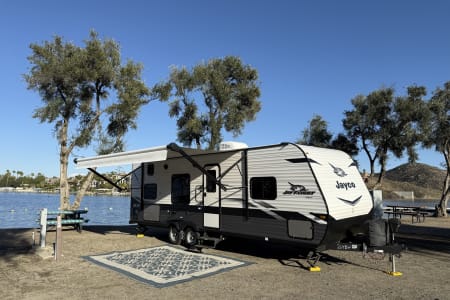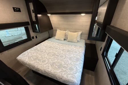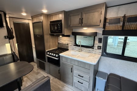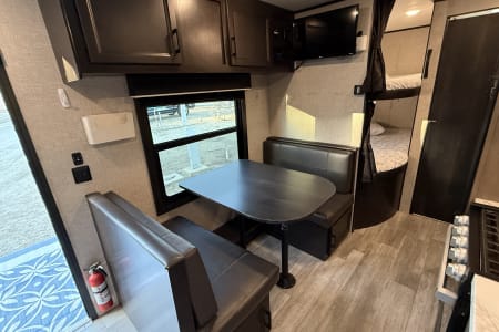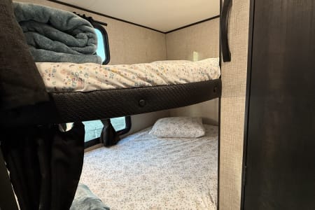 Our bunk house style travel trailer is just the right size for your family to camp in style! It sleeps 6 adults comfortably(can sleep more with small children) feels like home when you are enjoying the great outdoors! The interior floor plan features a queen bed, double size bunk beds, sofa that opens into additional sleeping space, dinette which makes into additional sleeping space, enclosed bathroom with tub/shower & toilet, separate bathroom sink area and a full kitchen including a refrigerator, freezer, microwave, 3-burner stovetop, oven, and double sink. You will also be able to enjoy the following comforts including A/C, Heating, aM/FM/Bluetooth Multimedia Audio System. Please feel free to message us if you have any questions. We look forward to assisting you have the best camping trip!!!