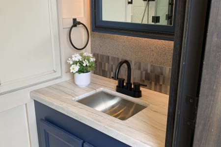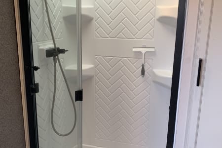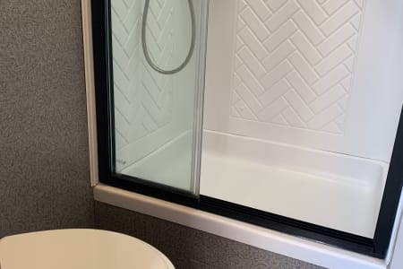 ✅ Full Bathroom – Large shower, vanity, and flushing toilet for a true home-like experience.