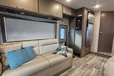 All the comforts of home, but anywhere you want to take them! This fully loaded RV sleeps 8 adults (10 - 11 people if some are children). With a full tank of gas, under average use, the generator will run for 4 to 5 days if shore power isn't available. Never driven an RV? No worries, it drives like a van or large truck and has cameras at the rear and sides to ensure safe handling! Automatic leveling, a large awning, outdoor television (with 2 more inside), and a fully functional kitchen with cooktop, gas range, convection microwave oven and large refrigerator/freezer will make getting set up and enjoying your campsite a breeze! The 31E has plenty of storage to put camp chairs, folding tables, screen tents, and more.