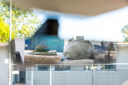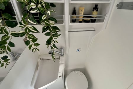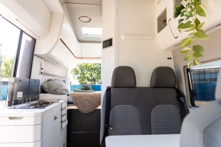 The interior is modern and fresh, with a cozy and spacious seating group with an extendable table and 2 luxurious swivel pilot chairs. For sleeping - 2 sleeping places at the back in the fixed transverse bed (approx. 1.40 - x 1.93 m) and 2 upstairs in the pull-out top bunk. allowing you to sleep 2, 3, and 4 people.