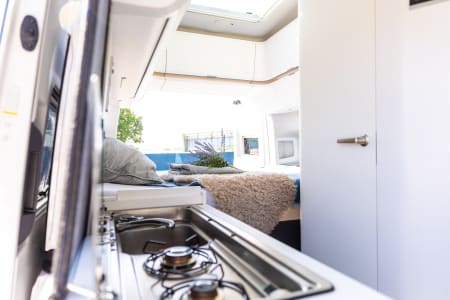 The complete kitchen has a 2-burner gas stove, sink with hot and cold water, and a very large 95-liter refrigerator with a freezer compartment. The spacious bathroom is equipped with a toilet, sink, and a fully lockable shower. For extra comfort, all windows are equipped with sliding fly screens and blackouts. You get a gas bottle and fully charged leisure batteries for a comfortable trip. The cabine also has airco for cooling on a hot day in the sun.