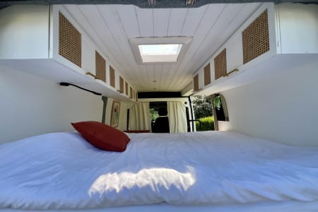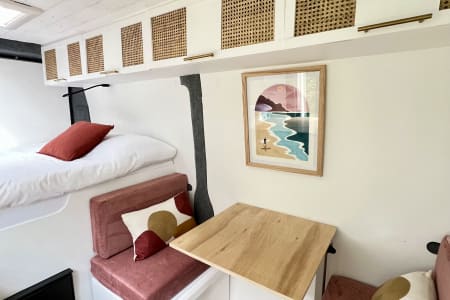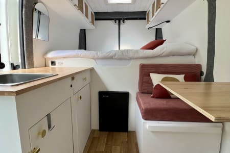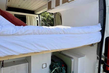 🛌 D'un lit fixe de 140x195 (2 pers) et d'un lit enfant de 70x185. Nous fournissons également les couettes, oreillers et draps