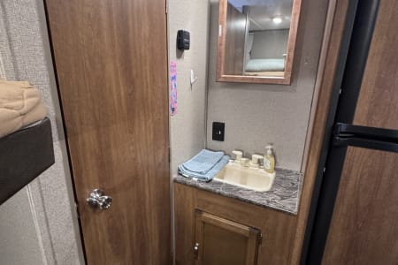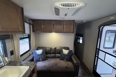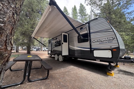 When it comes to amenities, the Keystone Springdale Summerland has it all. The kitchen is fully equipped with a full large dual-door refrigerator freezer that can easily store a week’s worth or more of food, stove, microwave, and plenty of storage space for all your cooking needs. The bathroom features a spacious shower and toilet, so you can freshen up after a day of outdoor fun. Our ideals were additionally met by having a separate bedroom area and a full large sink with a high faucet. The bonus was the very comfortable futon couch with flip-down center cupholders. The radio with speakers inside and outside easily connects to Bluetooth, and you can download the Jensen Jcontrol app to remote control your tunes from inside or outside.