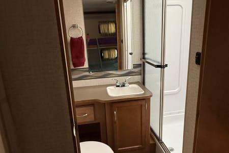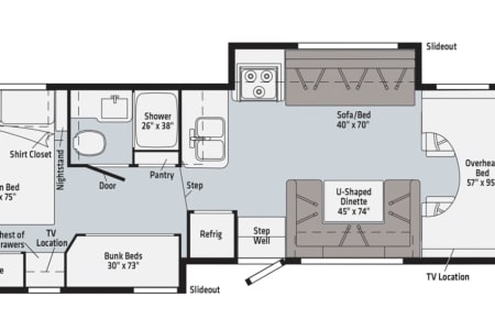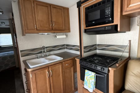 The full kitchen includes a three-burner stove, oven, microwave, refrigerator, freezer, and plenty of pantry space for all your meals on the go. The bathroom features a separate shower and toilet area for added convenience, and the slide-outs create a spacious interior for relaxing after a day of adventure.