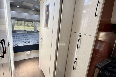 The central living area includes an ultra-comfortable dinette and a plush lounge that easily converts into additional sleeping space, perfect for guests or kids. The full galley kitchen is equipped with a gas stove, oven, microwave, large sink, refrigerator, and plenty of counter space—making it easy to prepare meals on the go. Overhead storage and sleek cabinetry provide space for everything you need for extended travel.