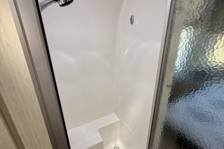 At the rear, you’ll find a generously sized full bathroom with a separate shower, toilet, and vanity—complete with storage cabinets and modern fixtures. Whether you’re getting ready for the day or winding down after a hike, this space offers comfort and privacy.