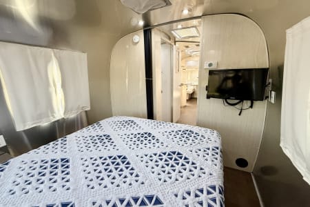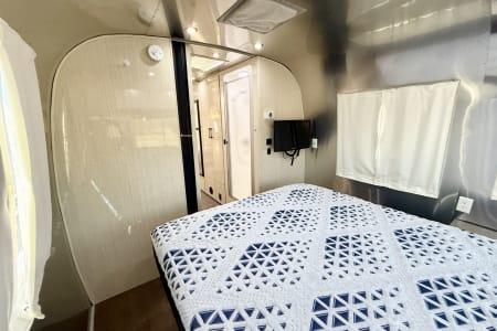 At 28 feet in total length, the 27FB floor plan features a front bedroom layout, placing the walk-around queen bed next to Airstream’s signature panoramic front windows. Wake up to stunning views, whether you’re parked by the beach, tucked into the woods, or overlooking a desert sunrise. With blackout shades and under-bed storage, the bedroom is as functional as it is inviting.
