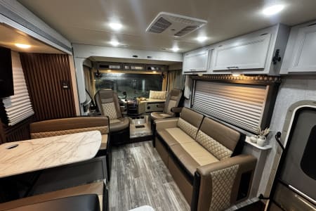 This spacious RV trailer sleeps up to 8 people and comes fully stocked for your next adventure. Setup is a breeze with a power 20’ awning and auto-leveling jacks at all four corners—just press a button and you’re ready.