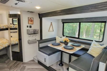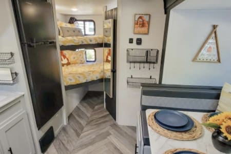 It has one slide out & comes equipped with a queen-sized murphy bed (with a luxury 3 inch memory foam mattress topper), full-sized bunk house (with luxury 2 inch memory foam mattress toppers), full-sized refrigerator & freezer, microwave, two-burner cook top, and indoor bathroom complete with shower, sink & toilet.