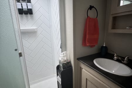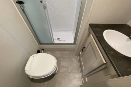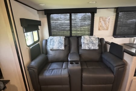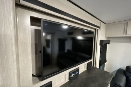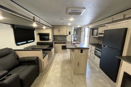 For those who prefer a camping experience that feels more like home, this travel trailer is an ideal choice. It features dual opposing slides in the living area and kitchen, creating a spacious interior where you can unwind on the theater seating, conveniently positioned across from the entertainment center and cozy fireplace. The kitchen is a chef's dream, equipped with an island, a three-burner cooktop, a hutch, and an 8 cu. ft. 12V refrigerator. You'll appreciate the comfort of the front private bedroom, which boasts a queen bed and dual wardrobes for ample storage. Additionally, this model offers an outdoor camp kitchen complete with an outdoor TV, making it perfect for enjoying the great outdoors.