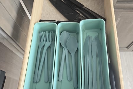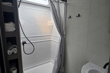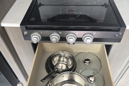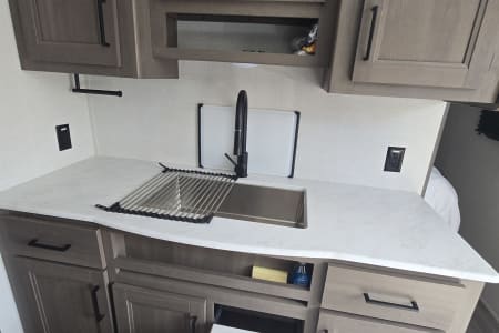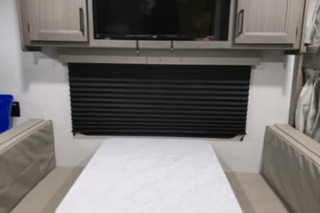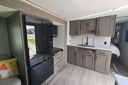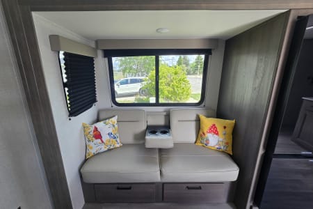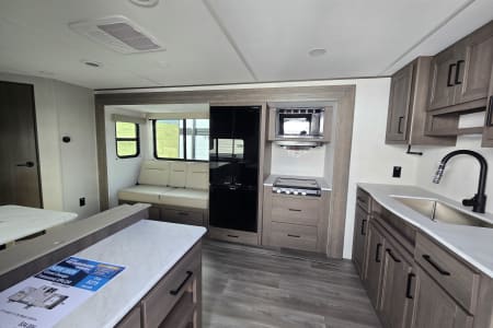 This is the perfect travel trailer if you like to camp with friends and family. Since there are double-size bunks, a queen bed in the front bedroom, plus a booth dinette and sofa, you can sleep eight campers each night! The three burner range and microwave in the kitchen will let you cook meals each day, and the refrigerator will keep your cold items fresh. This model also includes a counter with extra storage underneath, a pull-out trash can storage for convenience, and a full bath to freshen up in each day. And you'll love having your own space in the front bedroom