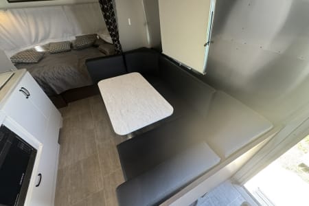 The 2021 Airstream Caravel 22FB is a compact, single-axle travel trailer that combines Airstream's signature aluminum design with modern comforts. At 22 feet in length and weighing around 4,000 lbs, it features a spacious interior with a front queen bed and memory foam mattress, a U-shaped dinette that converts into additional sleeping space, and a full-width rear bathroom with a shower, vanity, and plenty of storage. The kitchen is equipped with a three-burner cooktop, stainless steel sink, microwave, and compact refrigerator. The Caravel also includes a hand-painted chassis, Goodyear tires, a powered hitch jack, and handcrafted Italian Lite-Ply cabinetry. Inside, panoramic front windows with blackout shades and a QuietStreamâ„¢ climate control system complete the experience, making it an ideal choice for both short getaways and extended adventures.