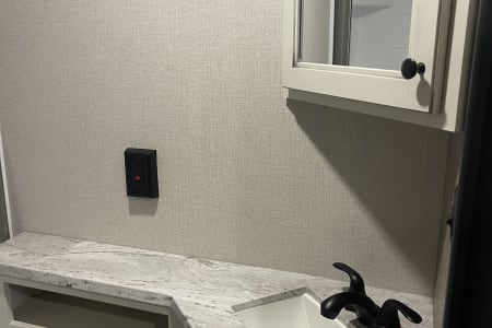 Bathroom: A conveniently located bathroom includes a shower, toilet, and sink, providing all the necessary amenities for a comfortable camping experience.