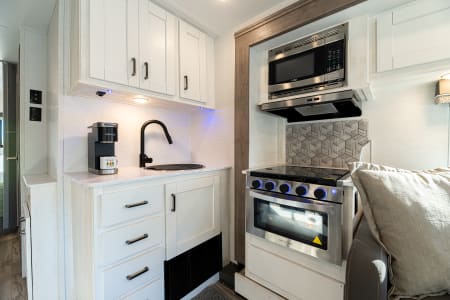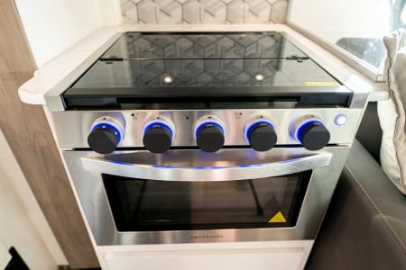 ~Gourmet Kitchen on the Go – Equipped with a 3-burner stove, oven, microwave, large fridge/freezer, and deep sink. Whether you're whipping up pancakes or grilling by the campfire, Connie’s got you covered.