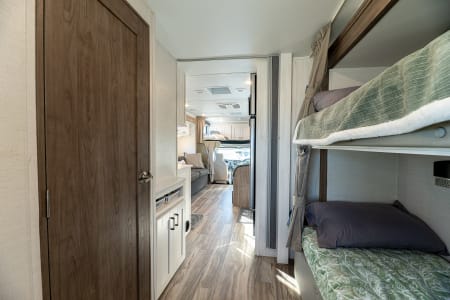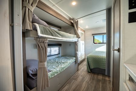~Sleeps up to 6 – Features a private queen bedroom, twin bunk beds, large over-cab bed, convertible dinette, and a comfy sleeper sofa. Plenty of room for the whole family!