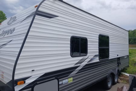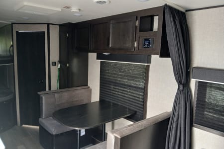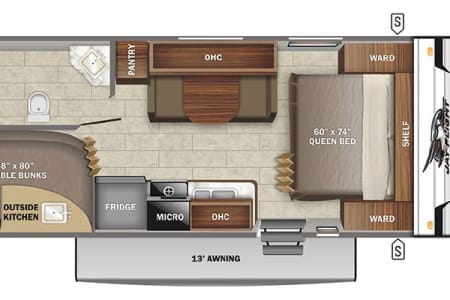 The whole group will want to join you on your next camping trip with this trailer! From having a full bathroom with a shower to having double-size bunks with a privacy curtain and a front bedroom with a privacy curtain, this will be one comfortable camper! There is a three-burner range and microwave, refrigerator and a pantry next to the booth dinette which doubles as extra sleeping space, And the cook will have an outside kitchen to utilize as well. The awning offers an outdoor living space, and there is exterior storage for your outdoor gear.