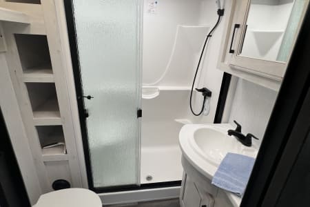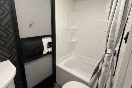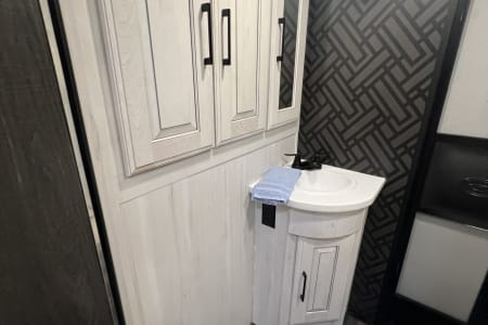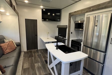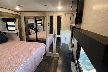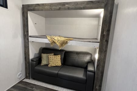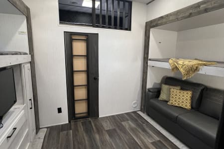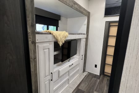 This camper can easily sleep eight people, and has a true two bedroom two bath layout. It even has a small bathtub in the second bathroom there’s a private bunk room that has his own television and a couch for the kids and a door that you can close off For a little more privacy. The master bedroom has a king size bed, a nice size, shower and plenty of closet Space for an extended stay if you should choose to do that.