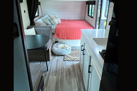 And for all the furry friends out there, this travel trailer is pet-friendly, so you can bring along Fido for the adventure (75lbs and under. No cats please).