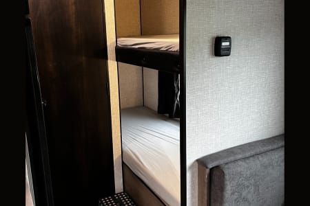 Step inside this cozy trailer, where modern amenities meet outdoor charm. The well-appointed interior boasts a comfortable sleeping arrangement, featuring a 60x80 queen bed for the master suite, ensuring a restful night’s sleep for adults. The two kid-approved bunks, measuring 29x75, are perfect for little adventurers, complete with thick cushions to keep them cozy after a day of fun. Plus, the dining table conveniently flips down into a fifth optional bed, providing flexible sleeping arrangements for larger families or extra guests!