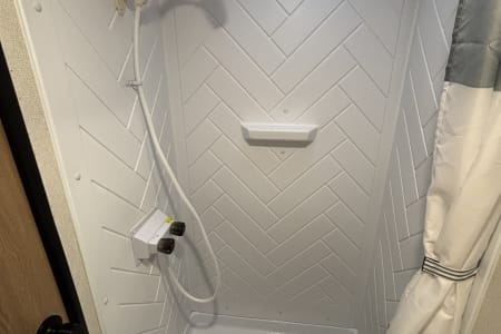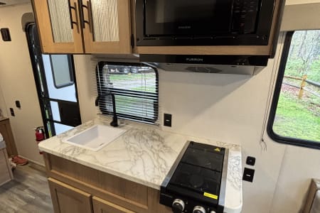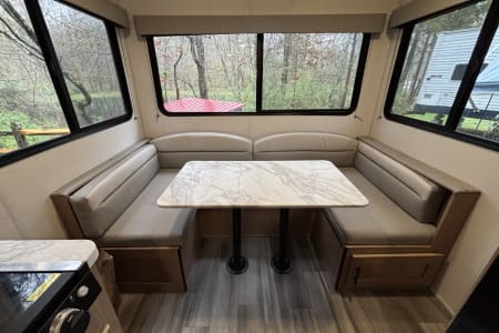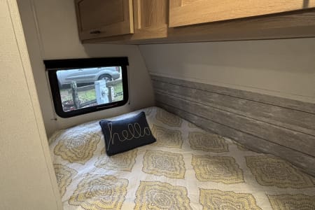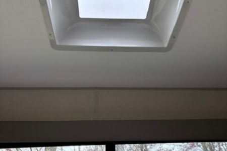 Bright, airy & open layout sleeps 4. Large windows and skylight pour light into the space. A permanent full bed is always ready for you while a dining banquet folds down into a second full bed. Nicely appointed kitchen with gas stove top, full bathroom with spacious shower. Motorized awning, outdoor shower, multiple outlets, USB & Lightning ports, remote start gas/propane generator and more.