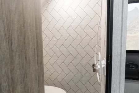 Bathroom: Wet bath with residential height foot pedal toilet and detachable shower head.