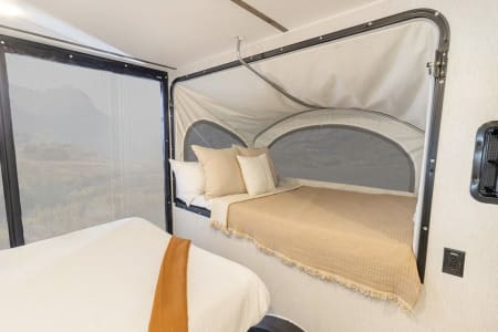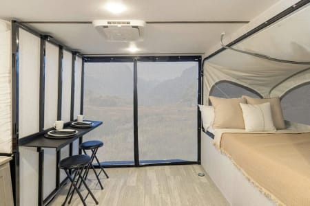 It’s an excellent choice for adventurers who want to explore the great outdoors without upgrading their vehicle or dealing with the challenges of towing a large camper. It can sleeps up to 4 people and offers the functionality of a full-size RV in a lightweight, compact design that’s easy to tow with an SUV.