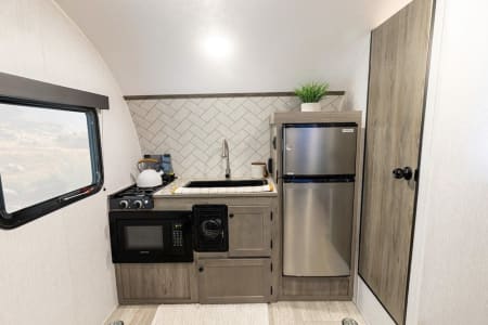 The Go Lite’s kitchen is thoughtfully designed to bring the comforts of home on the road. It features an 4.4-cubic-foot refrigerator and freezer, a full-sized residential farmhouse sink, a microwave, and a 2-burner stove, making cooking easy and enjoyable. Flip-up dining bar/desk—ready for you to enjoy breakfast with a view of the great outdoors (includes 2 stools).