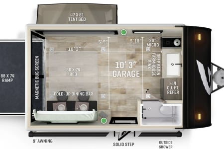 Despite its compact size, it provides impressive space. The fold-up bed (size 54X74) and pop-out tent (size 46X81) expand the interior, creating a roomy and comfortable environment. Keep the back ramp door open with the magnetic screen in place to let in a refreshing breeze and stay connected to nature.