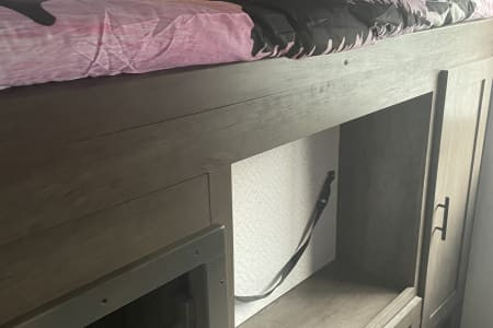 The dining table can open into another bed and the couch, making it a huge area for a fun sleepover with the kids! The camper comes with 2 TVs, a Bluetooth stereo, and a fireplace.