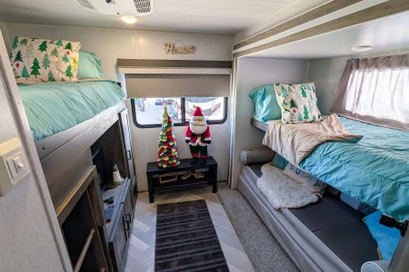 The private master suite and rear bunkhouse give everyone space to recharge, while the fully stocked kitchen lets you cook up your favorite meals with ease. Morning coffee on the outdoor chairs, evenings by the firepit, and days filled with paddle boarding, kayaking, or lounging under the awning—your escape unfolds at your pace.