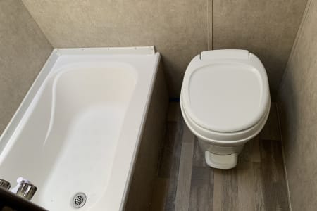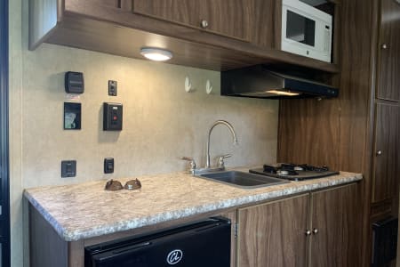 Enjoy sleeping off the ground with this bunkhouse that sleeps 5. Cooking is easy with 2-burner propane cooktop, microwave and propane/electric refrigerator. AC and heat for climate comfort. Lots of storage for your items. Bathroom with toilet and shower/tub. Push button awning for your outside activities.