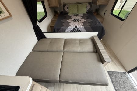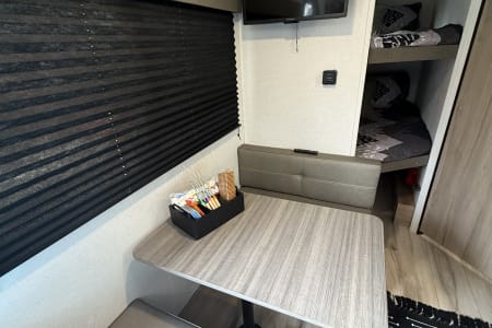 • Family-Friendly Comfort: Accommodates 8-10 guests with a queen bed, double full-size bunks, convertible dinette, and a convertible sofa.