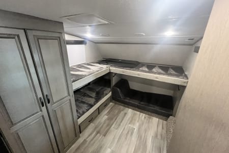 A bunkhouse up front with triple bunks and a hide-a-bed sofa