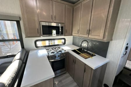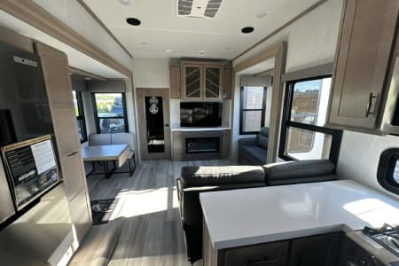 Step into a residential-style interior that feels more like a high-end condo than a camper. The main living room features: