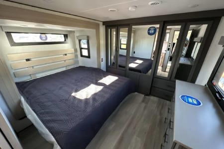 Private King Master Suite with slide-out for extra space, upgraded mattress, storage, and smart TV